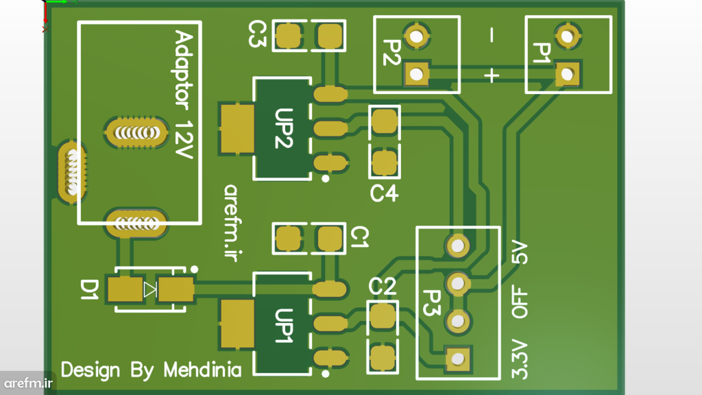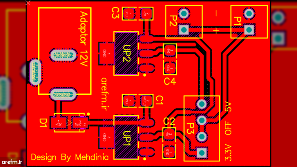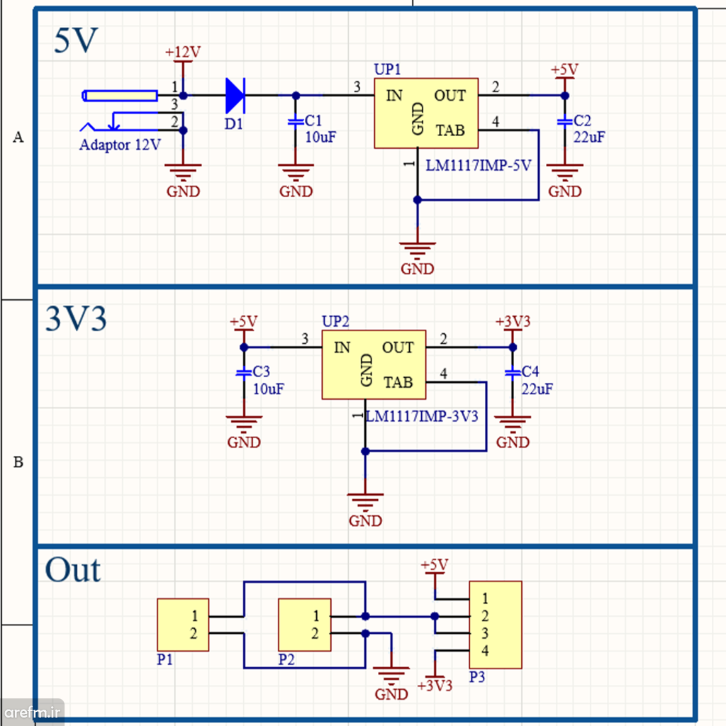 در این مدار، ما 12 ولت ولتاژ ورودی خواهیم داشت و با استفاده از دو رگولاتور ولتاژ AMS1117 ولتاژ 3.3 و 5 را خواهیم ساخت.